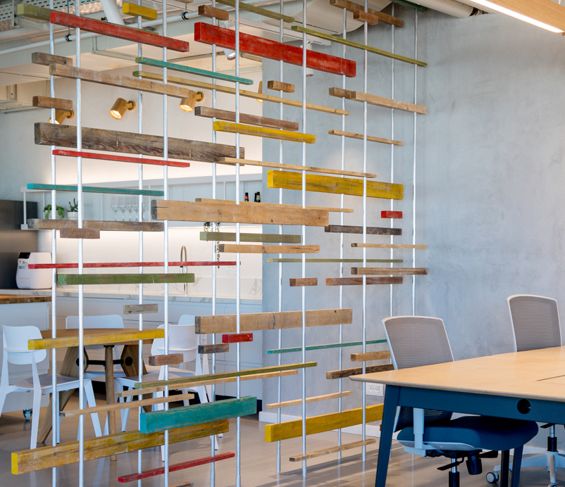 整個辦公室裝修設計中,最獨特的莫過了這個隔斷墻的設計了,說是隔斷,也是斷非斷的感覺,采用多種不同規(guī)格、不同長短、不同寬度的木條,再涂上不同的顏色,有著相互碰撞感,也增添了一絲活力,遠遠看去就像一柵格窗簾,奇妙又好看。