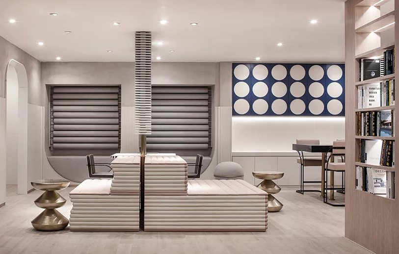 四樓是成熟和精英群體的大型工作空間。自動(dòng)扶梯附近的空間也作為公共接待區(qū),周圍有大型辦公區(qū),每個(gè)公司的員工都可以非常方便地到達(dá)工作區(qū)。通過在大面積上使用木飾面和灰褐色混凝土涂層,這個(gè)樓層的整體空間被賦予了穩(wěn)重和成熟的氛圍。運(yùn)動(dòng)器材的元素也可以在空間中找到,提醒人們在工作后注意身體健康,營造健康的工作與生活平衡。