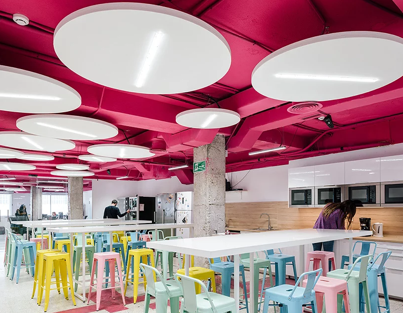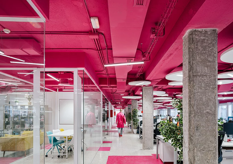 設(shè)計團隊選擇通過應(yīng)用“歡樂的色彩”來活躍辦公室裝修效果。靈感來自建筑物的地下室,最近被涂成了明亮的檸檬黃,設(shè)計師決定將這種顏色的使用擴展到所有樓層。