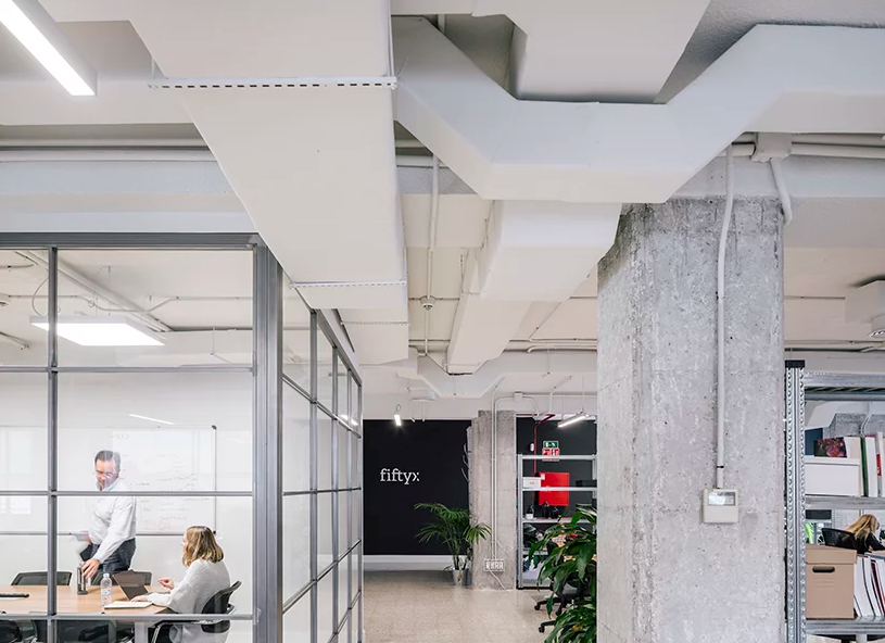 MARIANO是這家辦公室裝修設(shè)計的負責機構(gòu),他們將現(xiàn)有的工業(yè)建筑的特點(具有規(guī)則柱子和梁的混凝土結(jié)構(gòu))結(jié)構(gòu)元素,并且撤掉了原有的吊頂,保留原有的水磨石地磚,花崗巖的大堂和大面積的石灰石外墻。
