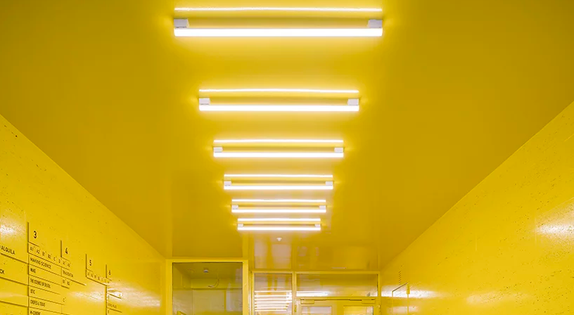 從地下停車場開始,黃色涂刷在所有的公共區(qū)和流通區(qū)域,只有現(xiàn)有的水磨石地板從大膽的色調(diào)中脫穎而出。不同的樓層有著不同的色調(diào),天花板上,燈具和周圍的白色墻壁突出。