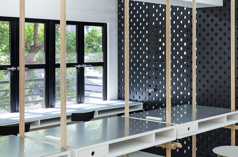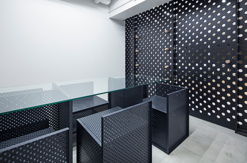 辦公室細(xì)節(jié)設(shè)計(jì)中使用的穿孔材料是公司自身產(chǎn)品制成的。這些穿孔,也用于E&Y生產(chǎn)的家具,在空間尺度上表達(dá)了企業(yè)的身份。該材料還用于傳輸空氣和光,減輕了行政室和會(huì)議室的限制條件。這些孔足夠大,可以插入用作門(mén)把手和擱板定位銷(xiāo)的木棍。員工可以在任何方便的位置輕松安排貨架。