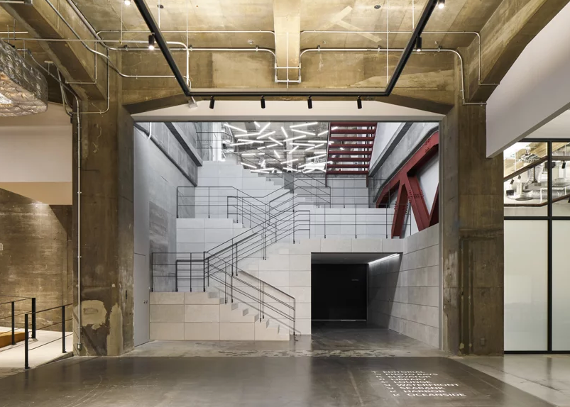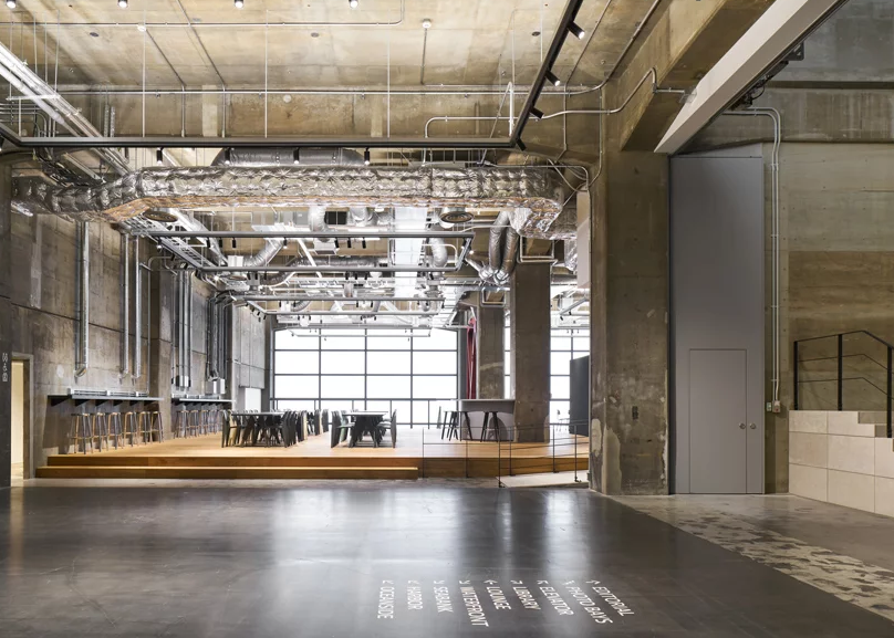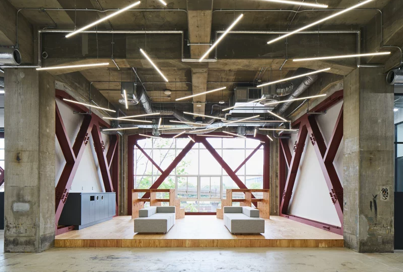 占地面積7500平方米、天花板高度6米的寬敞空間中,辦公室裝修設(shè)計(jì)利用現(xiàn)有空間的潛力和規(guī)模感,通過使用抗震支撐、涂有防銹漆的休息室、卡車泊位坡道以及簡單清理過的現(xiàn)有混凝土墻,辦公室裝修設(shè)計(jì)還充分利用了現(xiàn)有空間的潛力和規(guī)模感。