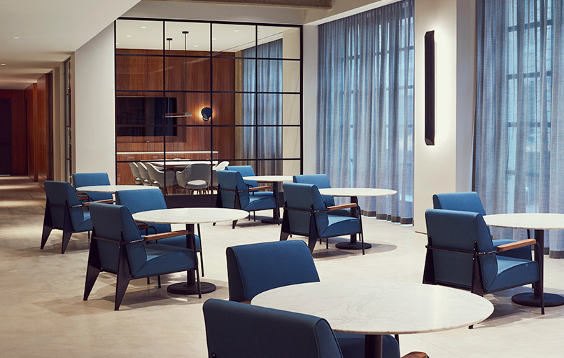 在辦公室裝修第五層是音響良好的私人辦公室,可容納1至6人,以及會議室、開放式辦公桌和充滿定制家具和裝飾藝術(shù)的休息室。辦公室裝修一間設(shè)備齊全的預(yù)備廚房里堆滿了大理石臺面、拋光的混凝土地板、伯托亞邊椅和橢圓形的eero Saarinen設(shè)計的餐桌-這不是典型的陳腐的辦公用品。