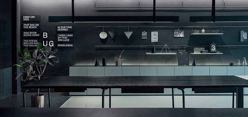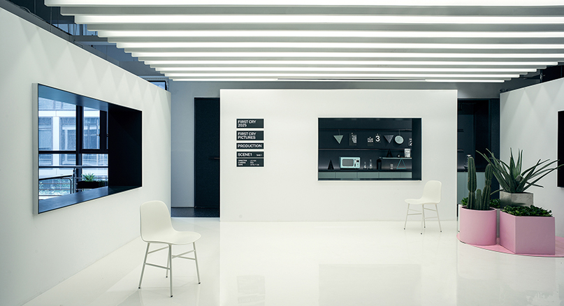 在電影辦公室的中心,辦公室裝修有一個小型投影室。 RIGI創(chuàng)造了純白色區(qū)域; 一個抽象的超現(xiàn)實空間,辦公室裝修粉紅色的裝置增添了戲劇感。材料和顏色主要是黑色和白色,就像電影本身一樣。不同質(zhì)地的黑色材料共同傳達出不同的感受。辦公室裝修墻上的文字是導演的第一部電影的名字。“第一次哭泣”被視為這個空間的名稱,因為嬰兒的第一次哭泣給人的感覺是最真實的。